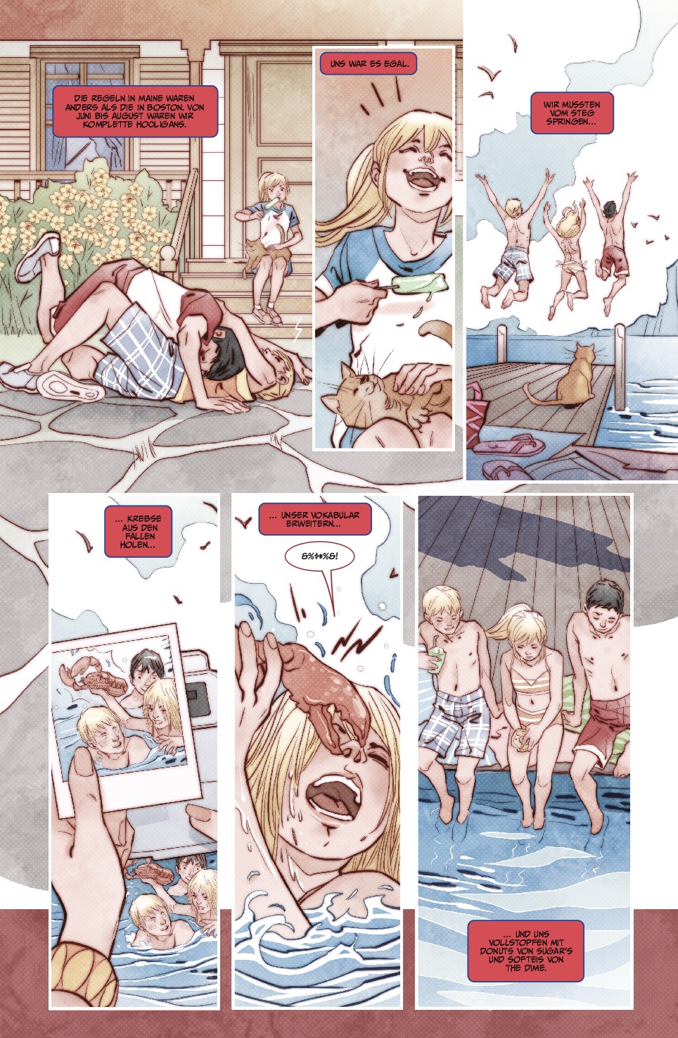 Deswegen kehrt Carol Danvers, so der bürgerliche Name der Heldin, in ihre alte Heimat in Form eines kleinen Küstenstädtchens zurück, in dem noch alte Bekannte und der Rest ihrer Familie in Form ihrer Mutter und ihres Bruders wohnen. Dort entdeckt sie jedoch nicht nur etwas nötige Ruhe, sondern auch einige dunkle Geheimnisse ihrer Familie, sowie Spuren zum Ursprung ihrer Superkräfte, der nicht ganz der bis dato bekannten Kontinuität entspricht. Hinzu kommt die Bewältigung ihrer Kindheitserinnnerungen, die zwischen idyllisch und brutal schwankt. In diesem Sinne eine eher ungewöhnliche Basis, die zwar mit der Konfrontation mit einer auf tödlicher Mission befindlichen Kriegerin der Kree gewohnte Zutaten bereit hält, aber nicht dem Fehler aufsitzt Action mit einer hanebüchenen Handlung zu rechtfertigen. Den Kern macht immer noch Carols familiäre Tragödie aus, deren überraschende Wendungen das sind, was den Leser antreibt die spannende Geschichte bis zum Ende zu verfolgen. Ich für meinen Teil bin mit Captain Marvel: Die ganze Geschichte tatsächlich das erste Mal über die Figur gestolpert und kann sagen, dass ich Augen und Ohren nun etwas weiter aufsperren werde, um solche Perlen wie diesen Sammelband (im Original: The Life of Captain Marvel #1-#5) nicht zu verpassen.