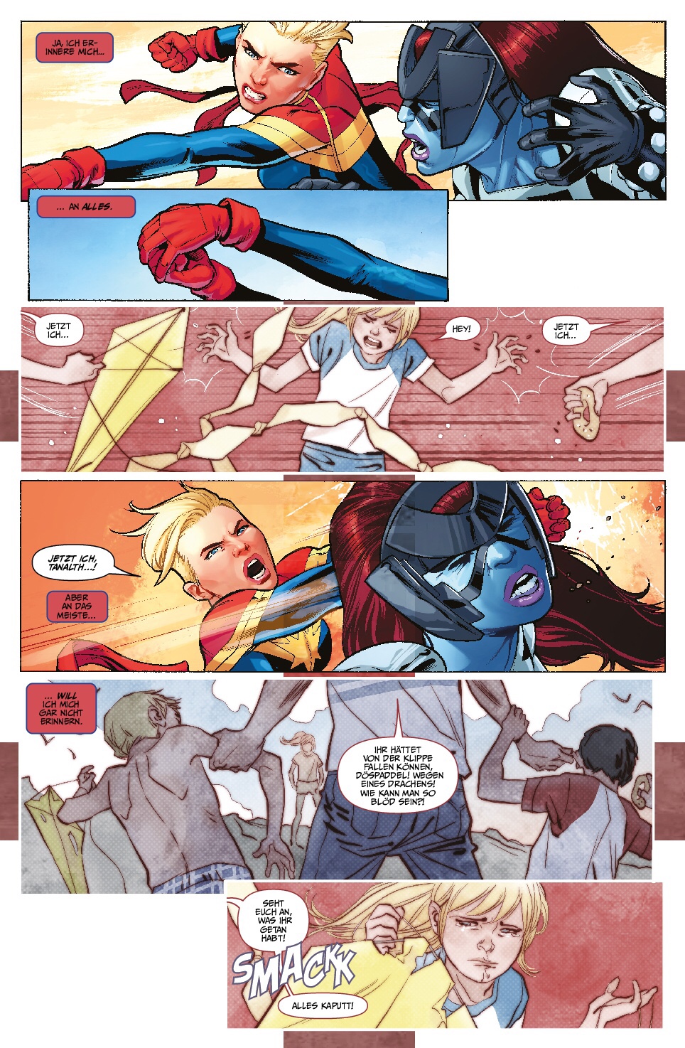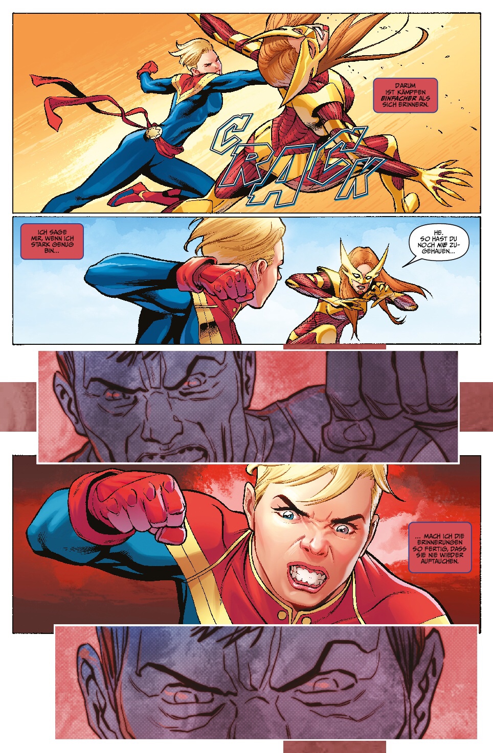 Im Detail steigt man zunächst unter der Voraussetzung ein, dass man zumindest weiß wer Captain Marvel ist. Sie ist eine übermächtige Superheldin, die mit sogenannten Kree-Kräften (eine Alien-Rasse) ausgestattet, regelmäßig im Universum unterwegs ist, um Gutes zu tun. Das tut sie auch am Anfang der Geschichte in Zusammenarbeit mit den Avengers, bis sie mitten im Kampf Erinnerungen an ihre von häuslicher Gewalt geprägten Jugend einholen, die sich in zügelloser Wut gegen ihre Gegner manifestieren. Vollkommen entfesselt, muss sie daher von Iron Man aka Tony Stark zur Räson gebracht werden, der ihr empfiehlt auf Heimaturlaub zu gehen, um wieder zu sich selbst zu kommen.