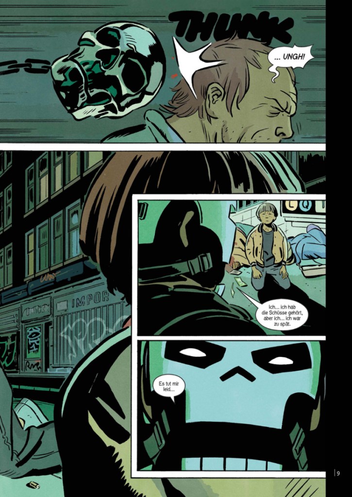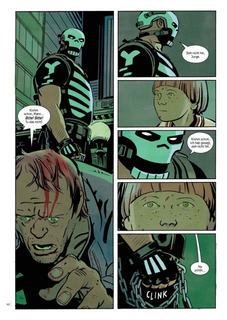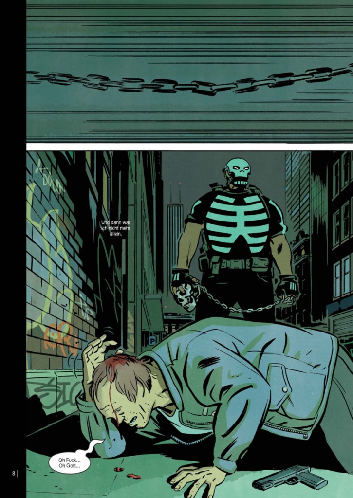 Diesmal mit dem kroatischen Zeichner Tonci Zonjic an seiner Seite, entführt uns Lemire in seiner Geschichte erneut nach Spiral City und stellt uns den Antihelden Skulldigger vor, der rastlos Verbrecher jagt und diese unter anderem mit seinem an einer Kette befestigten Totenschädel unter die Erde bringt. Doch zunächst beginnt die Geschichte mit einem Jungen, dessen Eltern bei einem Raubüberfall sterben, während er als Waise überlebt. Klingt irgendwie vertraut? Das ist wie bei Black Hammer üblich gewollt und geht wie gewohnt als charmante Hommage mit einem speziellen Twist durch. Denn besagter Junge wird nicht zu einer Art Batman oder Robin, sondern gesellt sich als der Sidekick Skeleton Boy an die Seite von Skulldigger, um ebenfalls zum Verbrecherjäger ausgebildet zu werden. Dabei sind jedoch Gnade und Achtung vor dem Gesetz wie zu erwarten zweitrangig. Um die Grundlage der vorliegenden Geschichte zu vervollständigen, haben wir außerdem eine fast schon besessene Ermittlerin, die Skulldigger hinter Gittern bringen will und mit Grimjim einen Halbdämon, der Chaos sät und Spaß daran zu haben scheint ein düsteres Geheimnis mit sich herumzutragen.
