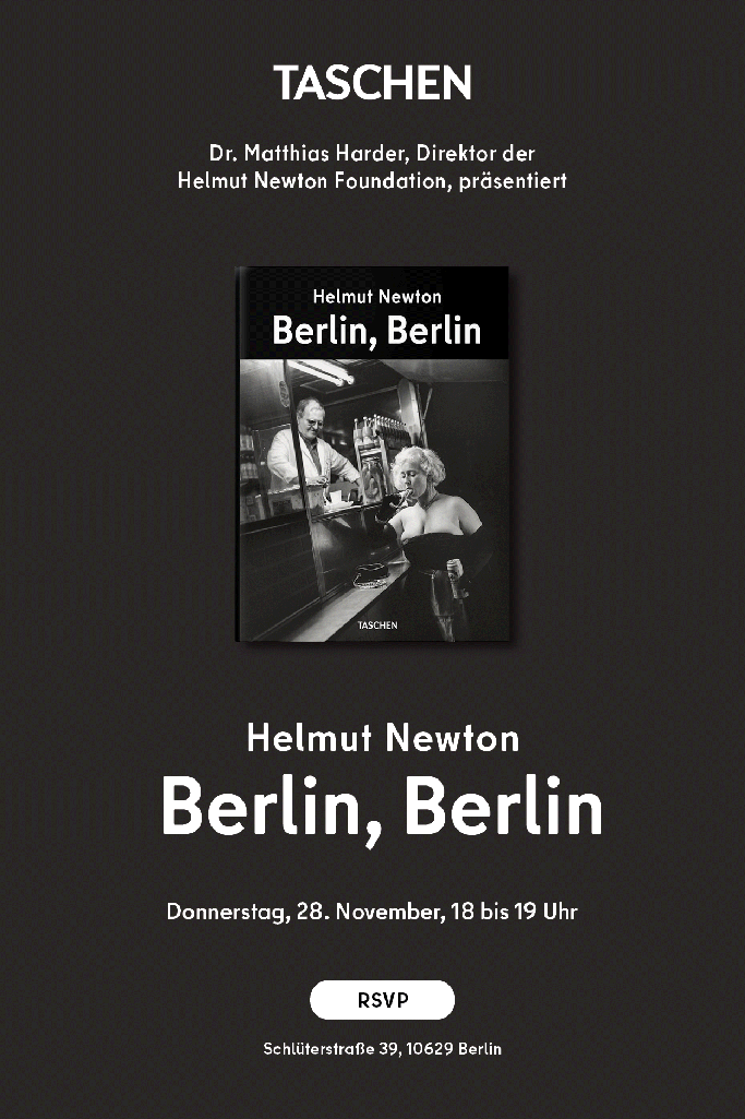 Wer mehr über das Buch erfahren möchte, sollte die Präsentation am Donnerstag, dem 28.11.2024, von 18 bis 19 Uhr im TASCHEN-Store Berlin nicht verpassen. Dr. Matthias Harder, Direktor der Helmut Newton Stiftung, wird Helmut Newton. Berlin, Berlin vorstellen. Weitere Informationen zum Buch und zur Veranstaltung findet ihr weiter unten.